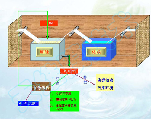 化成箔腐蝕加工過程中,產(chǎn)生大量的廢酸。這些廢酸的排放(即使采用石灰中和),不僅造成資源浪費,使產(chǎn)品成本增加,而且還導致嚴重的環(huán)境污染,影響和制約了企業(yè)的生存和發(fā)展。以一個中型的低壓電極箔生產(chǎn)企業(yè)為例,每天排放15—20%的廢鹽酸30噸,相當于浪費15—20噸31%的成品酸。采用擴散滲析技術,可將其中的鹽酸有效回收,每月節(jié)約鹽酸產(chǎn)生的經(jīng)濟效益在20萬元以上,同時還解決了環(huán)境污染問題,經(jīng)濟效益和社會效益十分可觀。